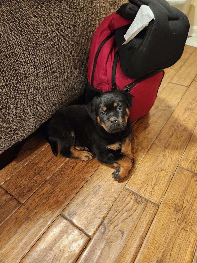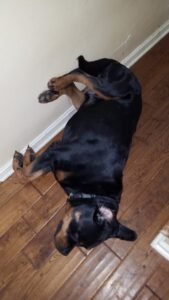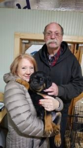 This left Xena as an “only” dog and it took about six months for us to gather our courage to get another dog. When we finally decided to get Xena a companion the search was on! We are picky about our Rotties and insist on pure bred dogs with full tails – I think docking tails (and ears for that matter) is barbaric and serves no useful purpose. I called and corresponded with a number of breeders and either the tails were docked or there were no pups available. Finally after about four months of searching I got a call from Amy at Gentry Creek Rottweilers that she would have pups available in mid February 2025. We were delighted with the news, especially since Xena came from Gentry Creek so we trusted the breeder and expected a wonderful pup.